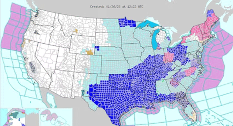 El NWS advirtió que nieve, aguanieve y lluvia helada amenazaron a casi 200 millones de personas, más de la mitad de la población del país, en una trayectoria desde el sur de las Montañas Rocosas hasta Nueva Inglaterra. Tras afectar al sur, la tormenta avanzó hacia el noreste el domingo, con previsiones de 30 a 60 centímetros de nieve desde Washington hasta Nueva York y Boston.
