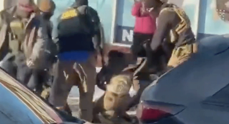 En las imágenes se ve a media docena o más de agentes enmascarados rodeando a un hombre que forcejea con ellos y parece resistirse en el suelo