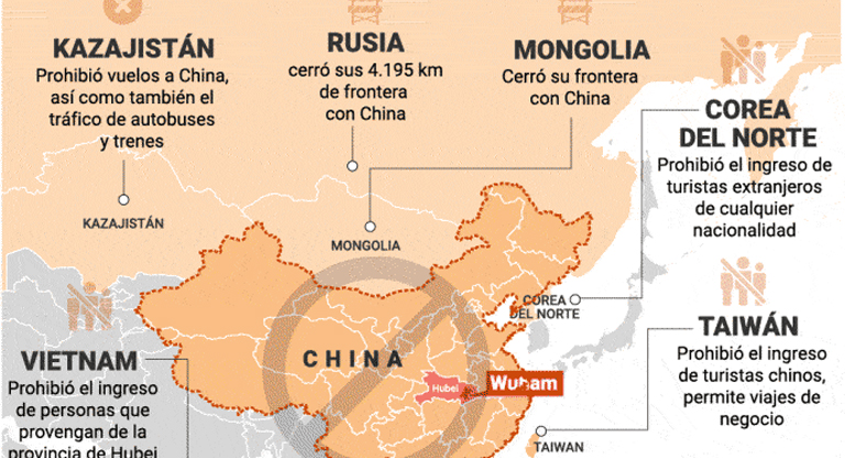 Mientras que Kazajistán, en el oeste, no alcanzó a cerrar la frontera (1.782 kilómetros) pero llegó cerca. El gobierno prohibió todos los vuelos a China, así como también el tráfico de autrobuses y trenes hacia el país.