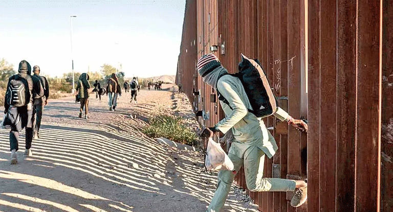 24 de junio de 2025, cruzando el muro por Sonoyta, Sonora, clave 63”, dice un delincuente, quien les abre la puerta hechiza en un tramo de la valla por donde ingresan dos hombres y cuatro mujeres camuflados y cargando bidones de agua pintados en negro para evitar destellos con el sol.