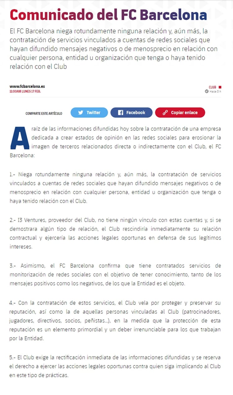 Por su parte, la compañía I3 Ventures también publicó un comunicado señalando que las acusaciones son falsas: “En relación con las informaciones divulgadas a través de un medio de comunicación en el día de hoy, en los cuales se hace referencia a un contrato con el FC Barcelona, a través el cual se establece la generación de contenidos ‘descalificadores’ a personas, deportistas y empresarios, queremos dejar constancia de que es absolutamente falso”.