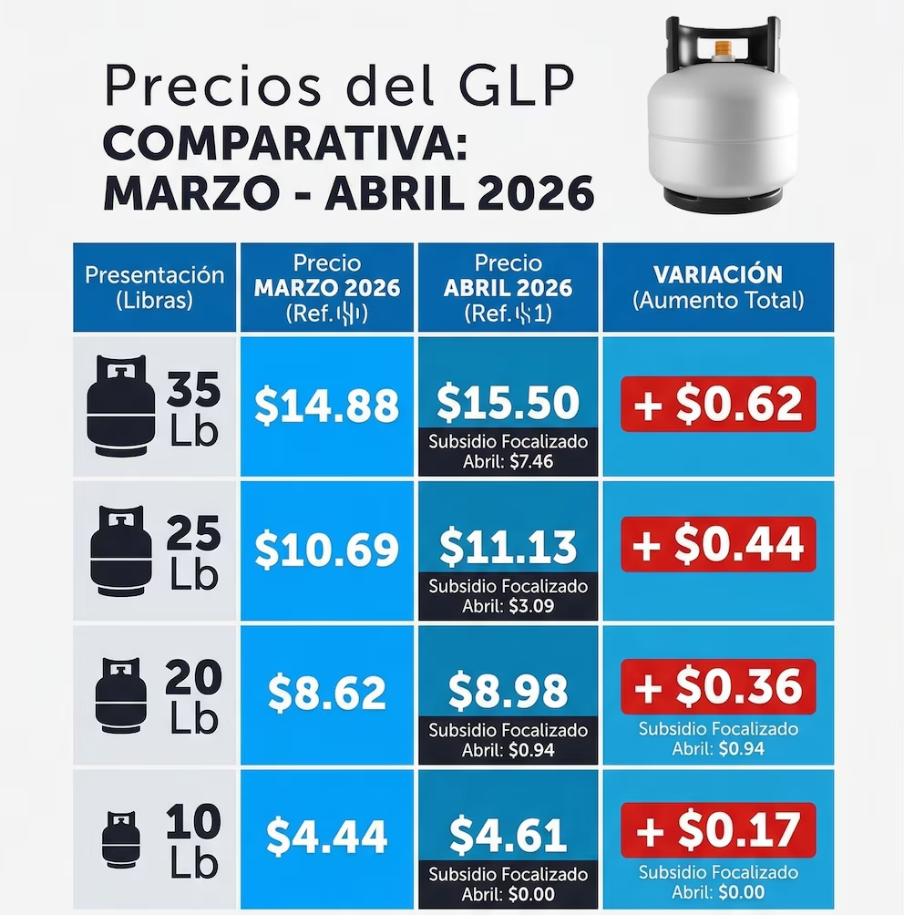 Aplicación del Mecanismo de Estabilización: Es importante informar que los precios publicados ya incluyen el beneficio de la “Ley Especial y Transitoria para la Estabilización de Precios del GLP”. Sin este mecanismo de compensación económica, el incremento para el consumidor final sería superior a las cifras actuales, ya que el Estado absorbe una parte de la fluctuación internacional para evitar un impactoinflacionario mayor en la canasta básica.