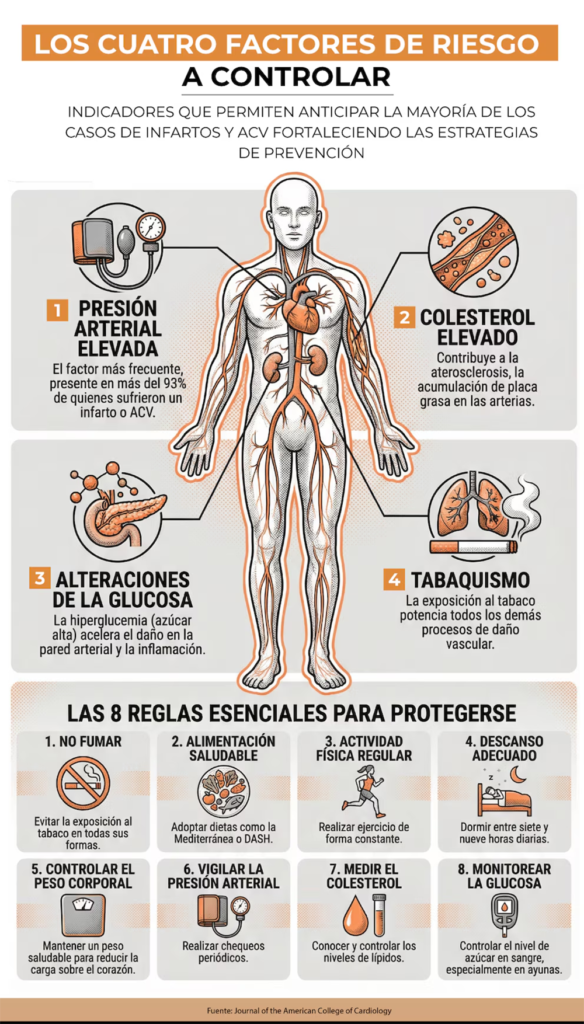 El síndrome metabólico —presión arterial elevada (más de 130/85 mmHg), glucosa alta, exceso de grasa abdominal y alteraciones lipídicas— incrementa considerablemente la probabilidad de sufrir un evento cardiovascular. La aterosclerosis, la acumulación de placas de grasa y colesterol en las arterias, es responsable de la mayoría de los infartos y ACV graves. Por eso, la prevención primaria es clave para disminuir la incidencia de estas patologías.