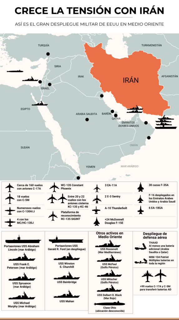 Washington tiene más de una docena de buques de guerra en Oriente Medio: un portaaviones (el USS Abraham Lincoln), nueve destructores y otros tres buques de combate. Es raro que haya dos portaaviones estadounidenses, que transportan docenas de aviones de guerra y están tripulados por miles de marineros, en el Medio Oriente.