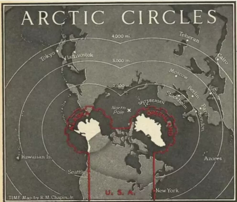 Mapa publicado en la edición del 27 de enero de 1947 de la revista Time, en el que se ilustra la ventaja estratégica que supondría para Estados Unidos la adquisición de Groenlandia