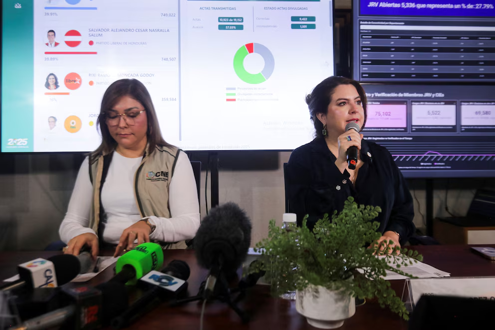 El conteo preliminar, detenido desde el viernes con el 88,02% de las actas escrutadas, muestra al candidato del Partido Nacional, Nasry Asfura, en primera posición con 1.132.321 votos (40,19%). Le sigue Salvador Nasralla, del Partido Liberal, con 1.112.570 votos (39,49%) y Moncada ocupa el tercer lugar con 543.675 votos (19,30%).