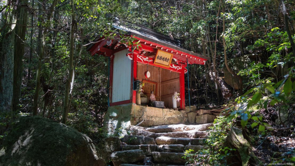 Templo rojo en el sendero del Monte Misen, donde turistas confiados en la IA quedaron atrapados al recibir horarios incorrectos del teleférico