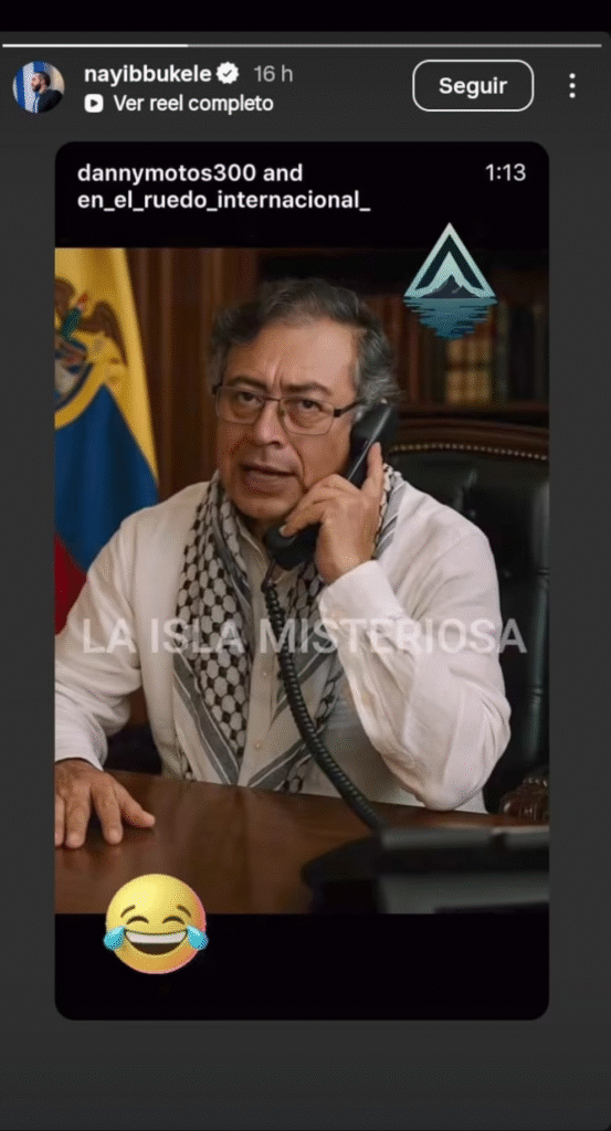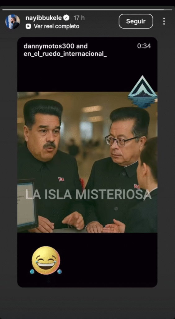 El material, creado por el usuario @dannymotos300 y publicado por el propio mandatario centroamericano en una historia de Instagram, acompañado de un emoticón con una cara sonriendo, utiliza animaciones para recrear una serie de conversaciones ficticias entre líderes internacionales, en un contexto de tensiones crecientes entre Venezuela, Colombia y Estados Unidos.