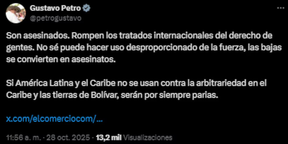 La reacción del presidente Gustavo Petro fue contundente. A través de su cuenta de X, el mandatario colombiano denunció que las personas involucradas en este ataque “son asesinados”.