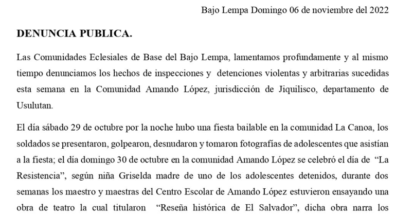La Fundación de Estudios para la Aplicación del Derecho (Fespad), alineada a la izquierda del país, denunció el domingo la detención «arbitraria» de «al menos 8 niños y jóvenes» en la comunidad Amando López, del Bajo Lempa, Jiquilisco, Usulután, en el oriente del país.