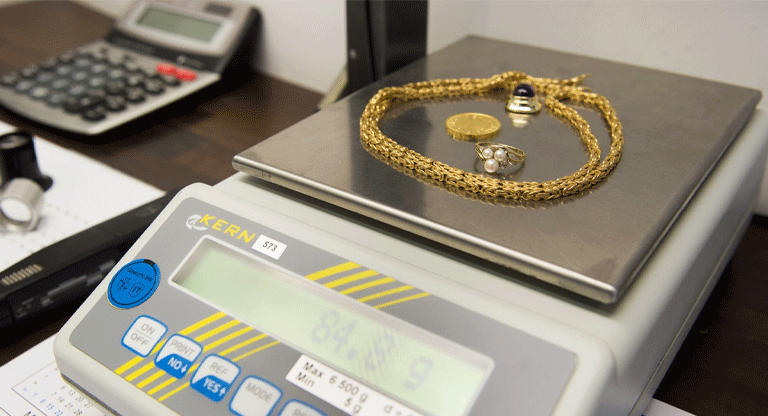 Por lo tanto, las agencias de protección al consumidor recomiendan (enlace externo) examinar cuidadosamente los grabados. Los números 333, 585 y 750 indican el contenido de oro en partes por mil. 333, por ejemplo, indica que un tercio del peso total es oro. Ahora necesita averiguar cuántos gramos de oro o plata hay en la joya. Puede usar fácilmente una báscula postal para esto.