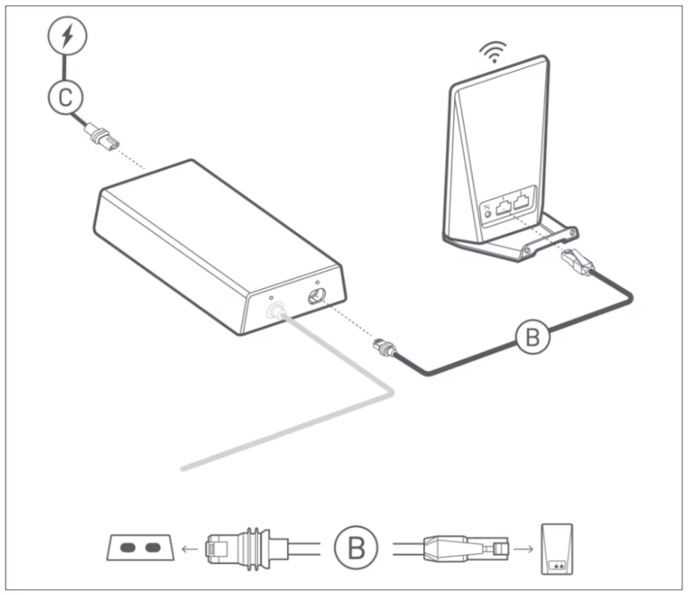 En contraste, el paquete Standard 4 X utiliza una fuente de alimentación diseñada exclusivamente para el router Gen 3, con un conector cilíndrico específico. Este router, además de enlazarse con la antena, ofrece la posibilidad de conectar otros dispositivos mediante dos puertos Ethernet LAN.