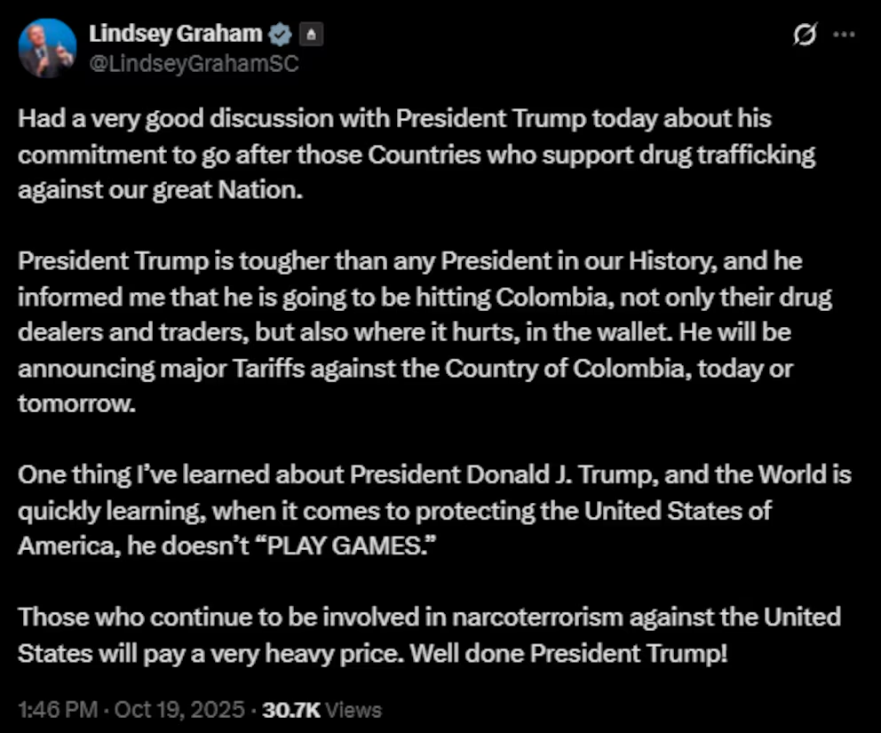 LindseyGraham, senador estadounidense, dijo que Donald Trumpo «va a atacar a Colombia» – crédito @LindseyGrahamSC/X