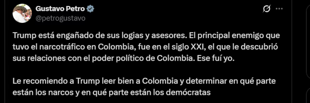 A las primeras declaraciones del presidente de EE. UU., Gustavo Petro aseguró que “Trump está engañado de sus logias y asesores”. Además, que “el principal enemigo que tuvo el narcotráfico en Colombia fue en el siglo XXI, el que le descubrió sus relaciones con el poder político de Colombia. Ese fui yo (sic)”.