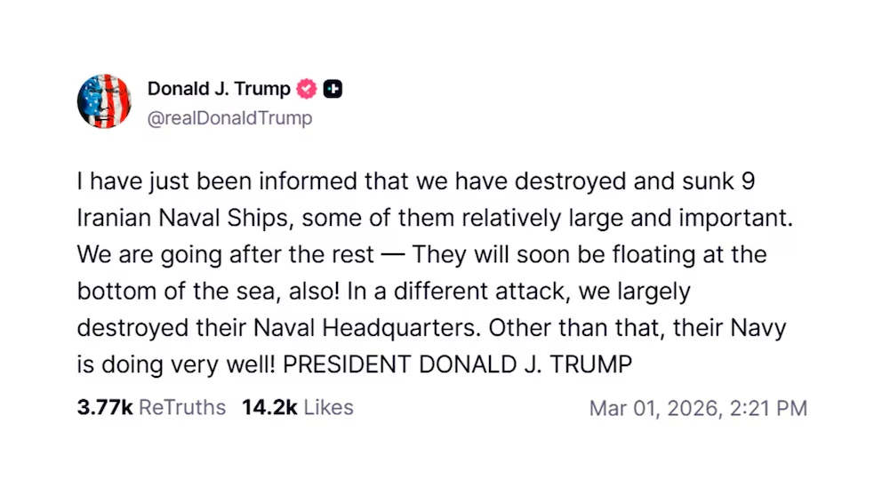 “Acabo de ser informado de que hemos destruido y hundido 9 barcos de la Marina iraní, algunos de ellos relativamente grandes e importantes”, dijo Trump en su plataforma Truth Social.